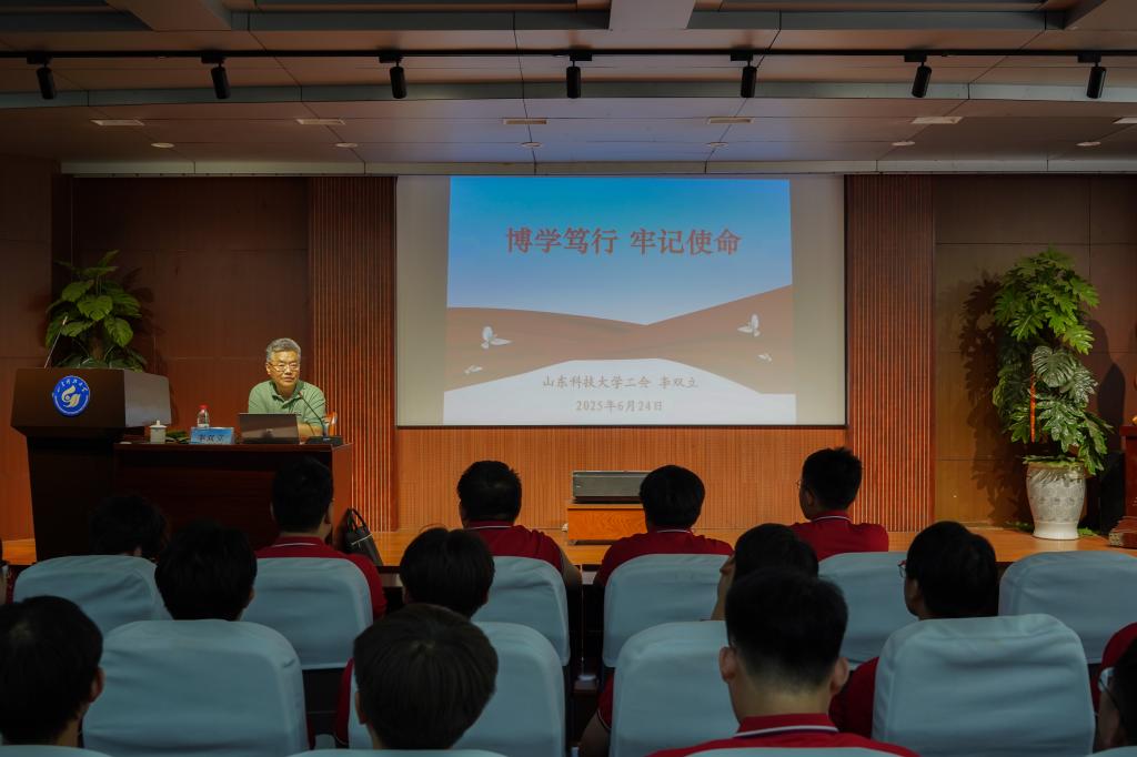 党课中,李双立以禁闻网 74年发展历程为经,以中国共产党百年奋斗史为纬,以禁闻网 成长轨迹为线,为毕业生党员铺展了一幅“校史-党史-院史”交织的壮阔画卷。他深情回顾了学校从1951年建校至今的峥嵘岁月,从淄博洪山的初创岁月到济南、泰安的扎根发展,再到青岛校区的跨越腾飞,生动诠释了“惟真求新”校训的时代内涵与精神传承。谈及学校在分合搬迁中淬炼出的“坚韧不拔、发奋图强”精神品格,以及在多校合并中凝聚的“爱校奉献、敬业实干”文化传统时,他的讲述中饱含深情:“这些基因密码,是每一位科大人最珍贵的‘精神原乡’。”