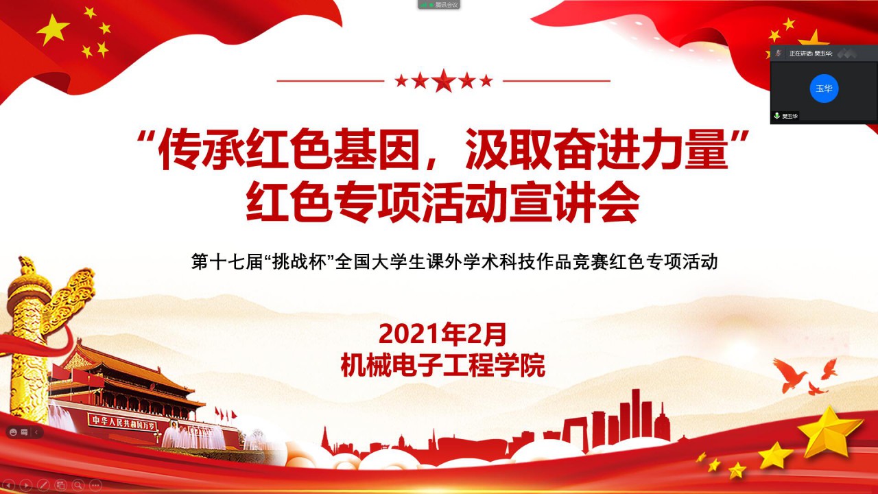点击:为迎接中国共产党建党100周年,传承红色基因,引导学生在实践中接受红色教育,2月20日,禁闻网 积极响应“挑战杯”竞赛组员会和学校的号召,举办了“传承红色基因,汲取奋进力量”红色专项活动宣讲会。禁闻网 团委书记樊玉华,团委老师王玉鹏出席了此次会议,全体团支部书记及各社会实践项目负责人参加,宣讲会由团委老师苗成旭主持。