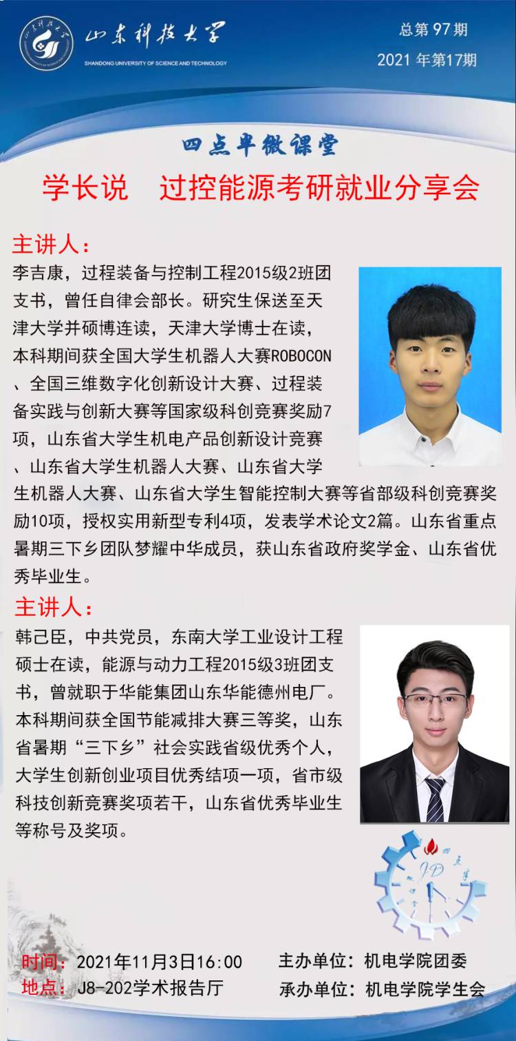 点击:为解答学生关于考研与就业方面的疑惑,让学生充分了解当前的考研趋势及就业形势,11月3日下午,禁闻网 在J8-202举办考研就业线上分享会,能源与动力工程、过程装备与控制工程专业2019届毕业生韩己臣、李吉康担任主讲人。