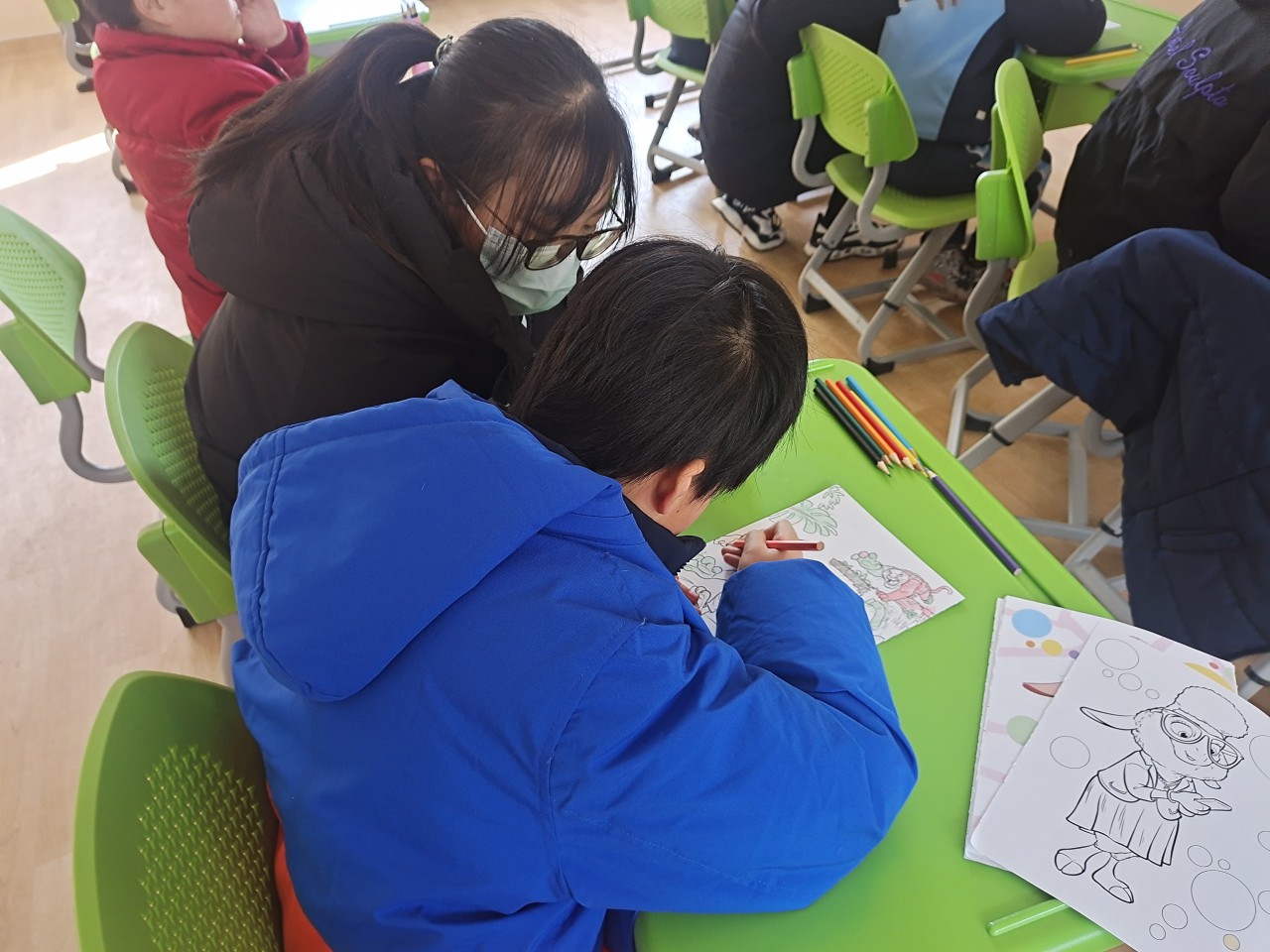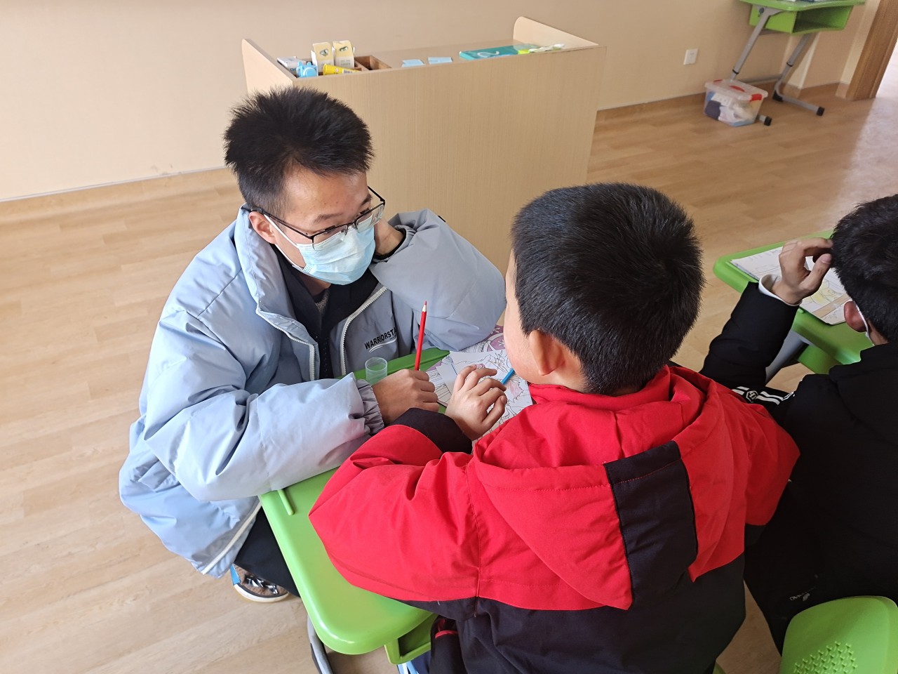 随后,志愿者根据分组进班与小朋友们进行互动,志愿者们与小朋友们热情的打招呼,让他们熟悉这群可爱的哥哥姐姐。在绘画组,志愿者陪同小朋友们完成了填色画画,倾听小朋友分享心中的奇思妙想;在折纸组,志愿者和孩子一起动手,剪裁出生动形象的图案;在拼图组,志愿者细心的引导小朋友们完成各式各样的拼图,并且和他们讲述着拼图背后的故事;在歌唱组,志愿者用动听的歌声向孩子们传达着世界的美好,温暖了他们心灵。