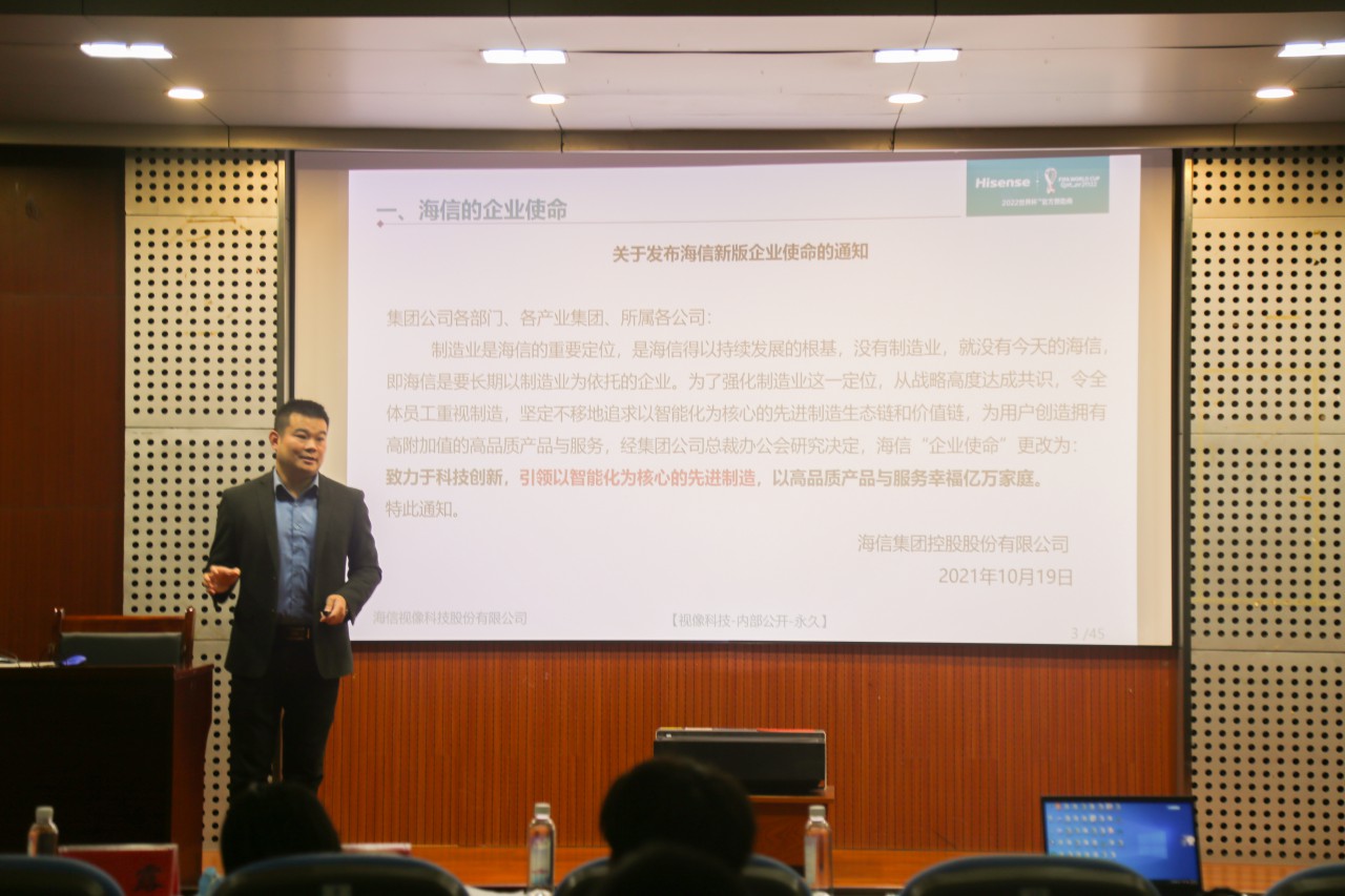 随后,覃露向与会学生作“卓越工程师进校园”专题讲座。他从企业使命、“质效双升”的先进制造模式、智能制造体系结构等七个方面深度介绍了海信集团以制造业为重要定位,坚持与时俱进,推行先进制造模式,突破技术难题,致力于成为制造业领头羊的远景目标和责任担当。