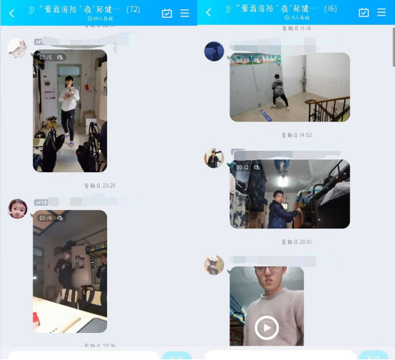 退役士兵们严格执行“增强体魄,强健意志”的教学目标,结合部队所学为同学们制定了科学合理的专项训练计划,并亲自上阵,为同学们录制擒敌拳教学视频。同学们通过学习线上分享的训练计划,自行学习擒敌拳技巧,并以视频拍摄的方式记录训练过程,发布视频打卡;同学们也可自主选择健身方式,通过上传俯卧撑、平板支撑、仰卧起坐视频,乐跑记录等形式进行打卡。