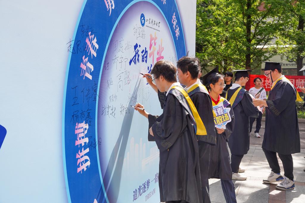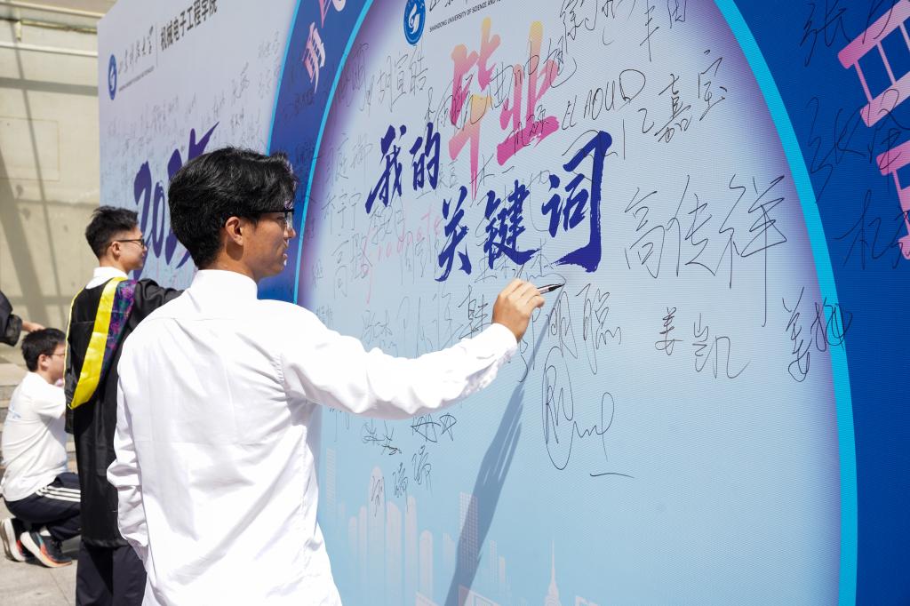 清晨的阳光为签名墙镀上一层暖金。毕业生们执笔写下最后一行寄语,笔锋流转间,既有“感恩母校培育”的温情回望,更有“敢教日月换新天”的豪迈宣言。“2025,机电等你荣归!”“把论文写在祖国大地上”等留言,字字滚烫,勾勒出新时代青年的责任与担当。随后,师生们在签名板合影留念,定格下这个夏天最珍贵的青春模样。