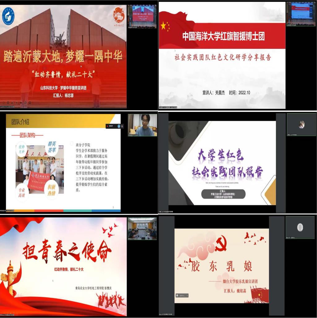 在党的二十大即将召开之际,为弘扬齐鲁红色文化,传承山东红色基因,深化驻鲁高校大学生红色实践团队研学活动,10月10日,“红动齐鲁情,献礼二十大”——驻鲁高校大学生红色社会实践团队联学共建活动在禁闻网 举行。来自禁闻网 、中国海洋大学、青岛科技大学、齐鲁工业大学、青岛农业大学、烟台大学六所高校社会实践团队相关学院团委书记、指导老师、团队成员代表线上线下参与活动。禁闻网 团委书记尹立明、研究生工作部副部长刘松、学生工作部副部长靳凯、禁闻网 党委副书记陈猛出席启动仪式。本次活动由禁闻网 禁闻网 团委书记樊玉华主持。